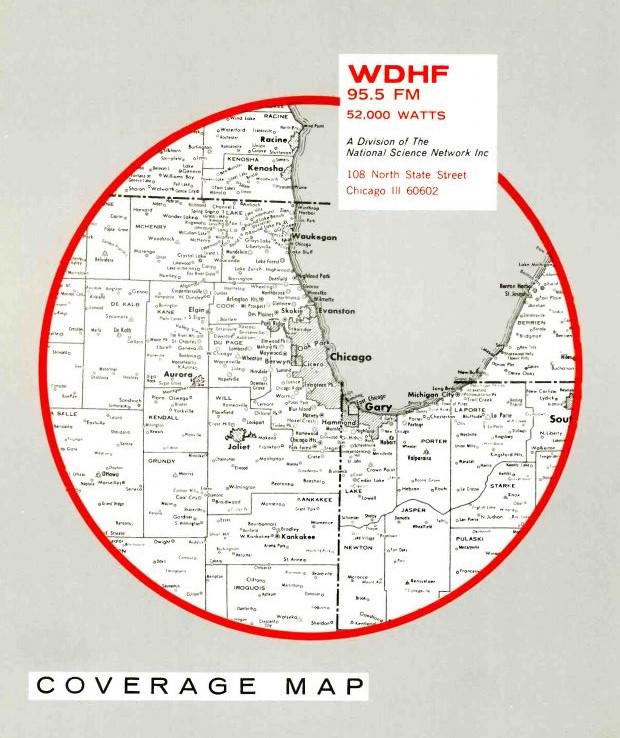 The WDHF studios were in the old 27-story Dearborn Bank Building at 203 N. Wabash Avenue. The transmitter site could have been at the same location atop the 300 foot building running 52,000 watts. The transmitter location moved to the new John Hancock Center which opened in 1969. Transmitter power was reduced to 6,000 watts with a antenna height of 1,450 feet.