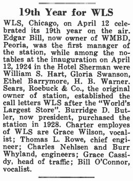 WLS radio began transmitting on April 12, 1924 with the call letters WBBX. The first test program was from the studios of WMAQ from the Tower Studio on April 9,1924 using the call letters WES (World Economy Store). Sears, Roebuck and Company located in Downtown Chicago, owned WES but on April 12th they changed the call letters to WLS (Worlds Largest Store).